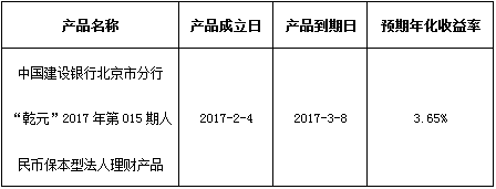 关于中国建设银行北京市分行“乾元”2017年第015期人民币保本型法人理财产品成立的公告