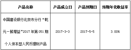 关于中国建设银行北京市分行“乾元—薪增益”2017年第051期个人保本型人民币理财产品成立的公告