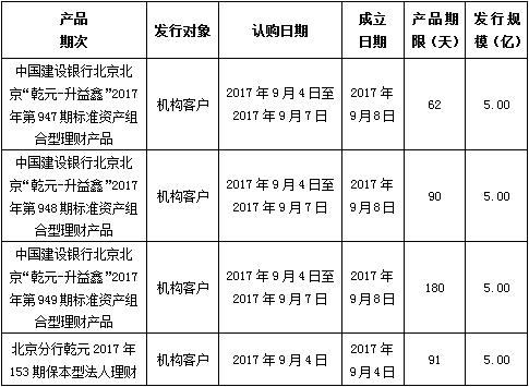 中国建设银行北京市分行定于2017年9月4日发行理财产品,现将相关发行情况公告如下: