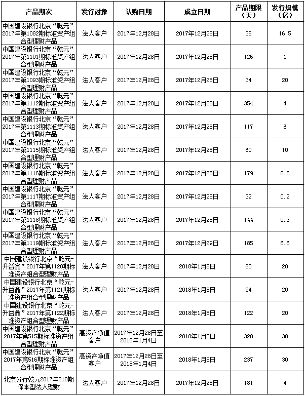 中国建设银行北京市分行定于2017年12月28日发行理财产品,现将相关发行情况公告如下: