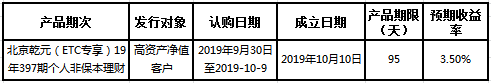 中国建设银行北京市分行定于2019年9月30日发行理财产品,现将相关发行情况公告如下:
