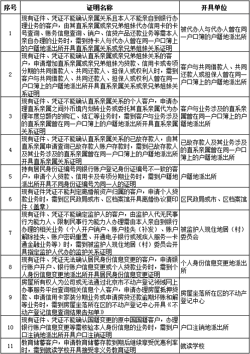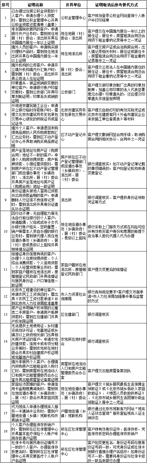 取消北京地区银行要求北京市行政机构事业单位开具证明目录(共19项)