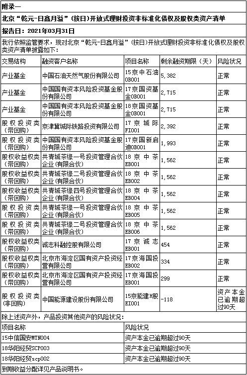 (2)本产品投资的债券18华阳经贸SCP002、18华阳经贸SCP003,金额各2亿元,未能按期足额兑付本息,已构成违约。本产品投资的债券18中信国安MTN001、15中信国安MTN004,金额各0.5亿元,未能按期足额兑付利息,已构成违约。上述资产在本产品组合资产中占比较小,本产品整体运作正常。