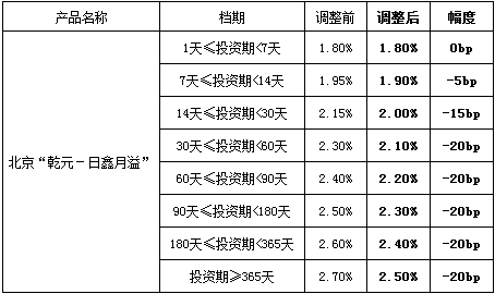 中国建设银行股份有限公司北京市分行拟于2021年9月26日(含)起,调整中国建设银行北京市分行“乾元-日鑫月溢”(按日)(产品编号:ZH072011001000Y01)、“乾元-天天享”(按日)(产品编号:BJ072016001000Y01)、“乾元-天天尊享”(按日)(产品编号:BJZX2017001000Y01)开放式资产组合型人民币理财产品客户预期年化收益率,具体如下表:
