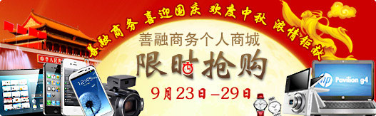 9月23日至9月29日,“善融商务”个人商城开展“欢乐双节”限时抢购活动,每天两场好礼大抢购,十款精选商品,实在优惠,诱人价格,等您出手! new iPad可以有,iPhone4s的绝唱,Galaxy SIII 9300闪亮登场!还有三星相机、摄像机、电动牙刷、精美书籍等居家、旅行必需之装备!更有手表、化妆品等佳节礼物哦!