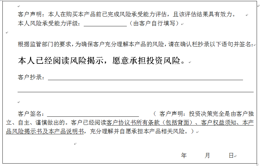 个人客户请在下面填写您的风险承受能力评级、抄录风险揭示语句并签字: