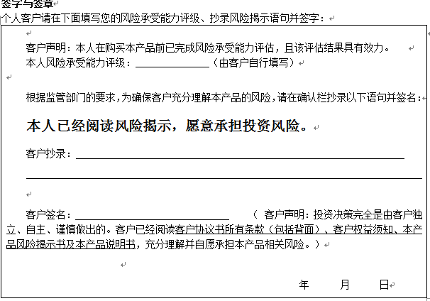 您签署本风险揭示书、客户协议书,并将资金委托给中国建设银行重庆市分行运作是您真实的意思表示。本风险揭示书及相应的客户协议书、产品说明书、客户权益须知将共同构成贵我双方理财合同的有效组成部分。