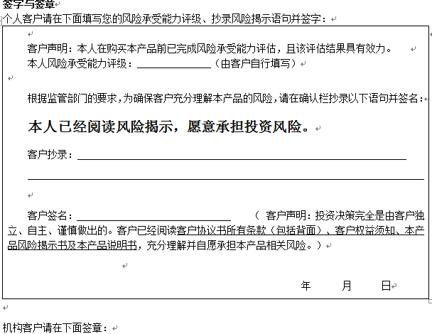您签署本风险揭示书、客户协议书,并将资金委托给中国建设银行重庆市分行运作是您真实的意思表示。本风险揭示书及相应的客户协议书、产品说明书、客户权益须知将共同构成贵我双方理财合同的有效组成部分。