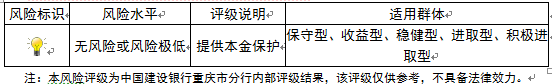 本期产品为保本浮动收益型理财产品,本理财产品有投资风险,只保障理财资金本金,不保证理财收益,您应当充分认识投资风险,谨慎投资。本期产品期限为55天(中国建设银行重庆市分行有权对产品进行展期或提前终止)。本期产品内部风险评级级别为一盏警示灯,风险程度属于无风险或风险极低,适用于保守型、收益型、稳健型、进取型及积极进取型投资者。最不利情况下,客户只能收回投资本金,不能获得任何投资收益。