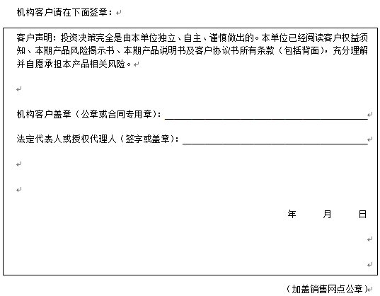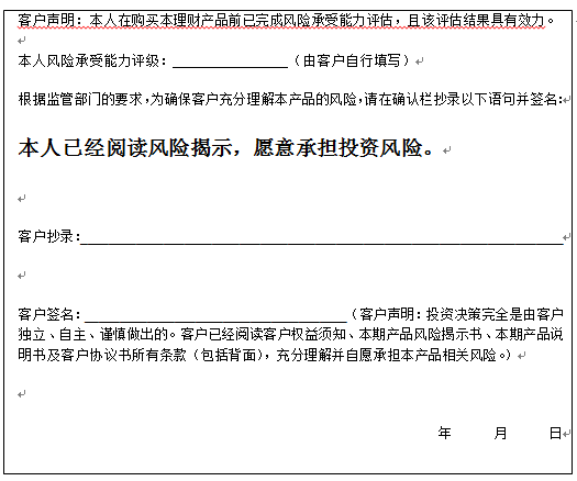 在您签署《中国建设银行股份有限公司理财产品客户协议书》前,应当仔细阅读客户权益须知、本风险揭示书及本产品的产品说明书的全部内容,同时向中国建设银行重庆市分行了解本产品的其他相关信息,并自己独立做出是否认(申)购本产品的决定。