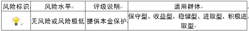 ,风险程度属于无风险或风险极低,适用于保守型、收益型、稳健型、进取型及积极进取型投资者。最不利情况下,客户只能收回投资本金,不能获得任何投资收益。