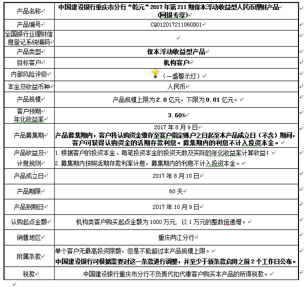 2.本产品规模下限:0.01亿元。在本期产品募集期内,对本期产品的认购金额未能达到本期理财产品规模下限,中国建设银行重庆市分行有权利但无义务宣布本期产品不成立。如产品不成立,中国建设银行将在通知客户产品不成立后1个工作日内返还客户已缴纳的认购本金至客户指定账户,客户应确保账户状态正常,并及时查询账户资金变动情况。