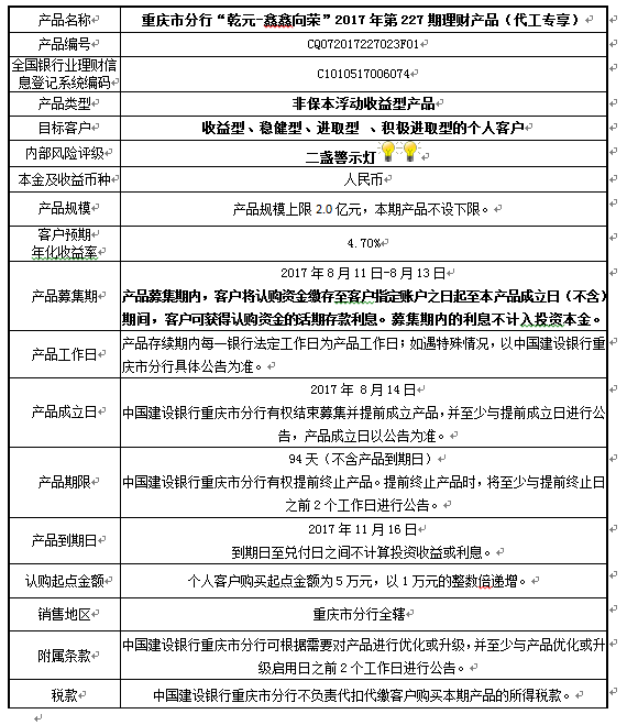 中国建设银行重庆市分行“乾元-鑫鑫向荣” 2017年第227期理财产品风险揭示书和产品说明书