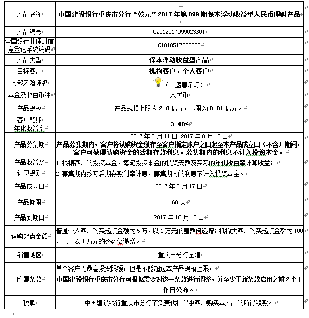 中国建设银行重庆市分行“乾元”2017年第099期 保本浮动收益型人民币理财产品说明书和风险揭示书
