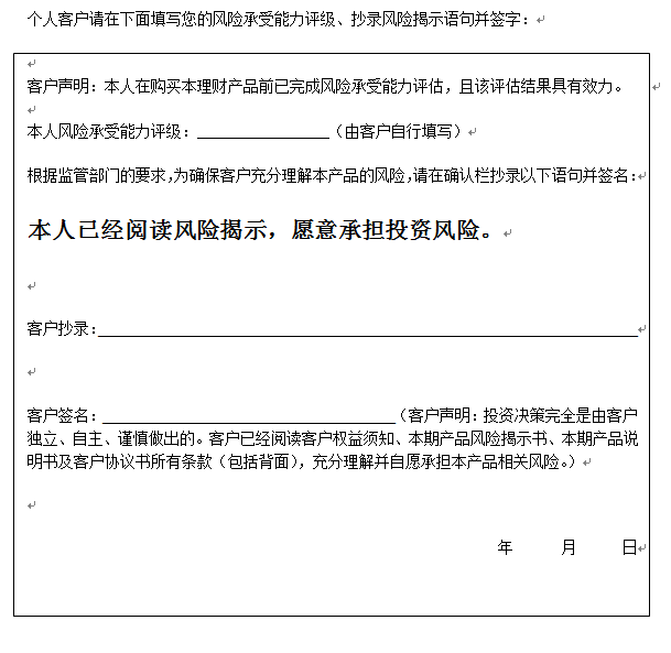 在您签署《中国建设银行股份有限公司理财产品客户协议书》前,应当仔细阅读客户权益须知、本风险揭示书及本产品的产品说明书的全部内容,同时向中国建设银行重庆市分行了解本产品的其他相关信息,并自己独立做出是否认(申)购本产品的决定。