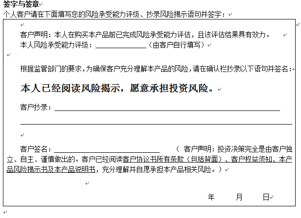 您签署本风险揭示书、客户协议书,并将资金委托给中国建设银行重庆市分行运作是您真实的意思表示。本风险揭示书及相应的客户协议书、产品说明书、客户权益须知将共同构成贵我双方理财合同的有效组成部分。