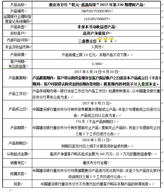 中国建设银行重庆市分行“乾元-鑫鑫向荣” 2017年第230期理财产品风险揭示书和产品说明书