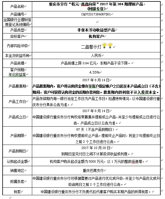 中国建设银行重庆市分行“乾元-鑫鑫向荣” 2017年第384期理财产品风险揭示书和产品说明书