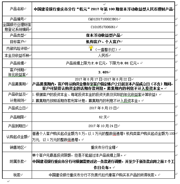 中国建设银行重庆市分行“乾元”2017年第100期 保本浮动收益型人民币理财产品说明书和风险揭示书
