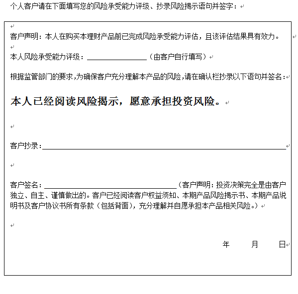 在您签署《中国建设银行股份有限公司理财产品客户协议书》前,应当仔细阅读客户权益须知、本风险揭示书及本产品的产品说明书的全部内容,同时向中国建设银行重庆市分行了解本产品的其他相关信息,并自己独立做出是否认(申)购本产品的决定。