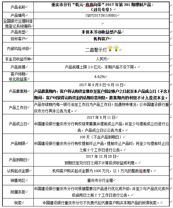 3.中国建设银行重庆市分行可根据市场情况等调整产品规模上、下限,并最迟于调整规模上下限当日进行公告。
