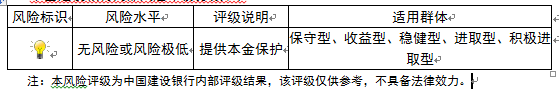 本期产品为保本浮动收益型理财产品,本理财产品有投资风险,只保障理财资金本金,不保证理财收益,您应当充分认识投资风险,谨慎投资。本期产品期限为36天(中国建设银行有权对产品进行展期或提前终止)。本期产品内部风险评级级别为一盏警示灯,风险程度属于无风险或风险极低,适用于保守型、收益型、稳健型、进取型及积极进取型投资者。最不利情况下,客户只能收回投资本金,不能获得任何投资收益。