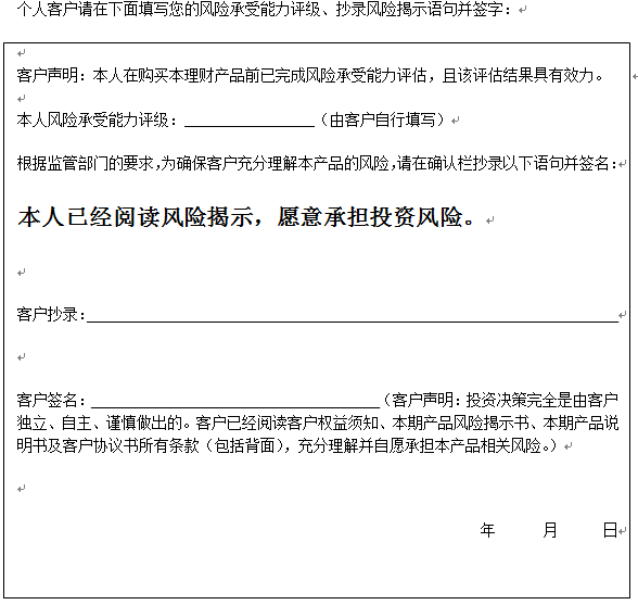 在您签署《中国建设银行股份有限公司理财产品客户协议书》前,应当仔细阅读客户权益须知、本风险揭示书及本产品的产品说明书的全部内容,同时向中国建设银行了解本产品的其他相关信息,并自己独立做出是否认(申)购本产品的决定。