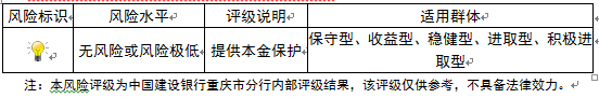 本期产品为保本浮动收益型理财产品,本理财产品有投资风险,只保障理财资金本金,不保证理财收益,您应当充分认识投资风险,谨慎投资。本期产品期限为90天(中国建设银行重庆市分行有权对产品进行展期或提前终止)。本期产品内部风险评级级别为一盏警示灯,风险程度属于无风险或风险极低,适用于保守型、收益型、稳健型、进取型及积极进取型投资者。最不利情况下,客户只能收回投资本金,不能获得任何投资收益。