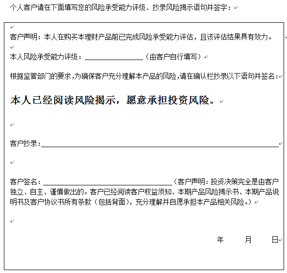 在您签署《中国建设银行股份有限公司理财产品客户协议书》前,应当仔细阅读客户权益须知、本风险揭示书及本产品的产品说明书的全部内容,同时向中国建设银行重庆市分行了解本产品的其他相关信息,并自己独立做出是否认(申)购本产品的决定。