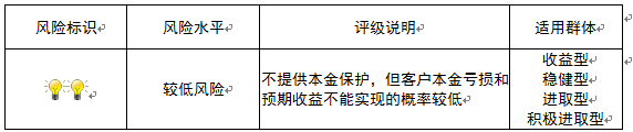 本期产品为非保本浮动收益型理财产品,不保证本金和收益。请您充分认识投资风险,谨慎投资。本期产品期限731天(中国建设银行有权对本期产品进行展期),存续期内产品不接受申购或赎回申请。本期产品内部风险评级级别为两盏警示灯,风险程度属于较低风险。最不利情况下,基础资产无法回收任何本金和收益,客户将损失全部本金。产品适合于收益型、稳健型、进取型及积极进取型客户。