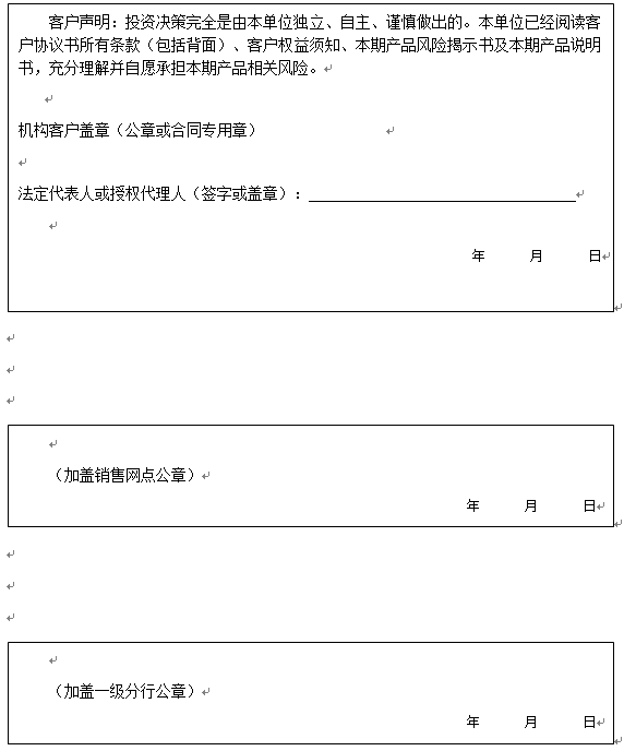 3.中国建设银行为客户提供本期产品相关账单信息。本期产品存续期内,机构客户可凭交易账户对应的开户印鉴、有效机构证件和《中国建设银行股份有限公司理财产品客户协议书》在中国建设银行营业网点打印本期产品相关账单信息。