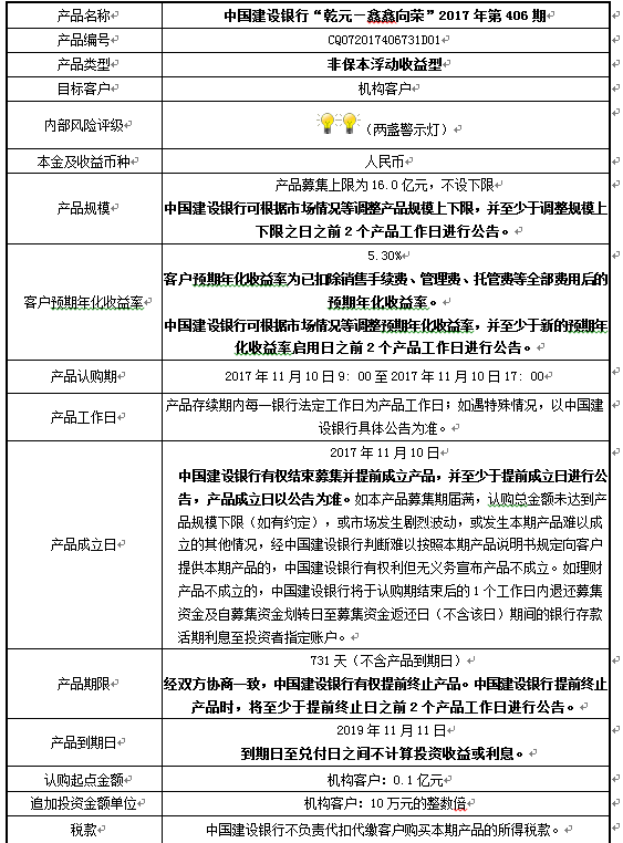 中国建设银行“乾元—鑫鑫向荣”2017年第406期 理财产品说明书和风险揭示书