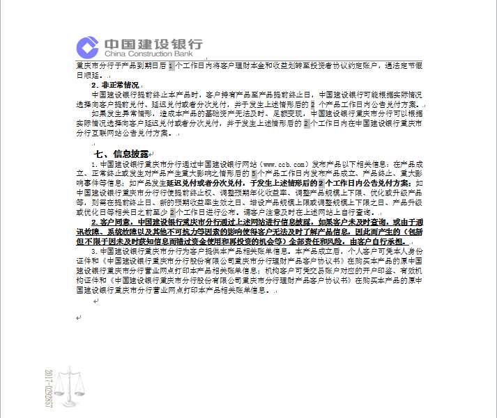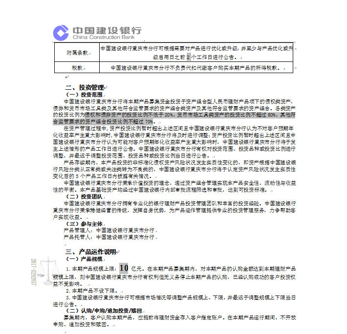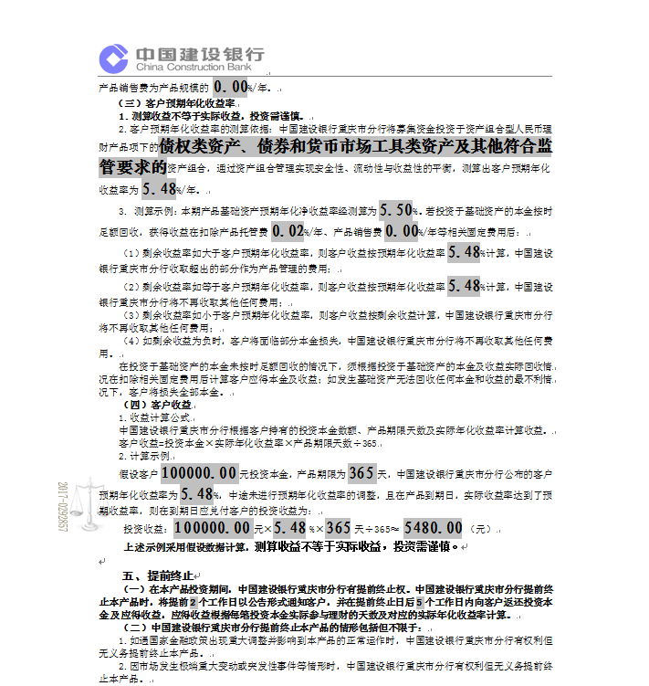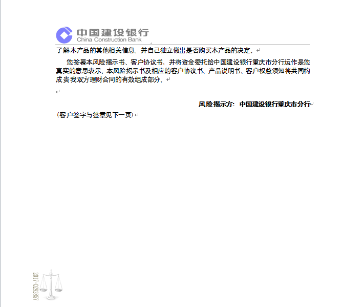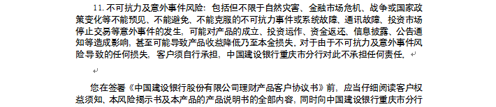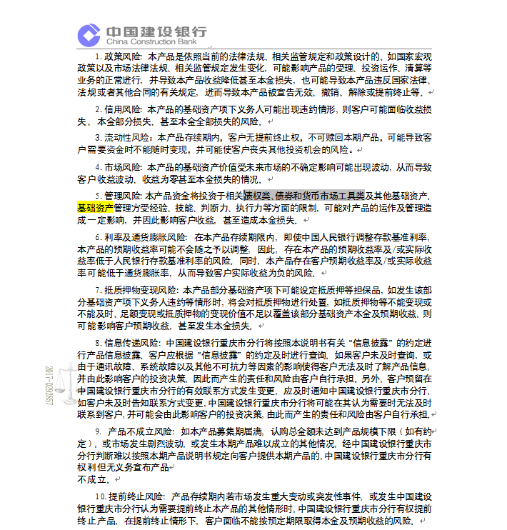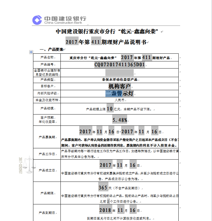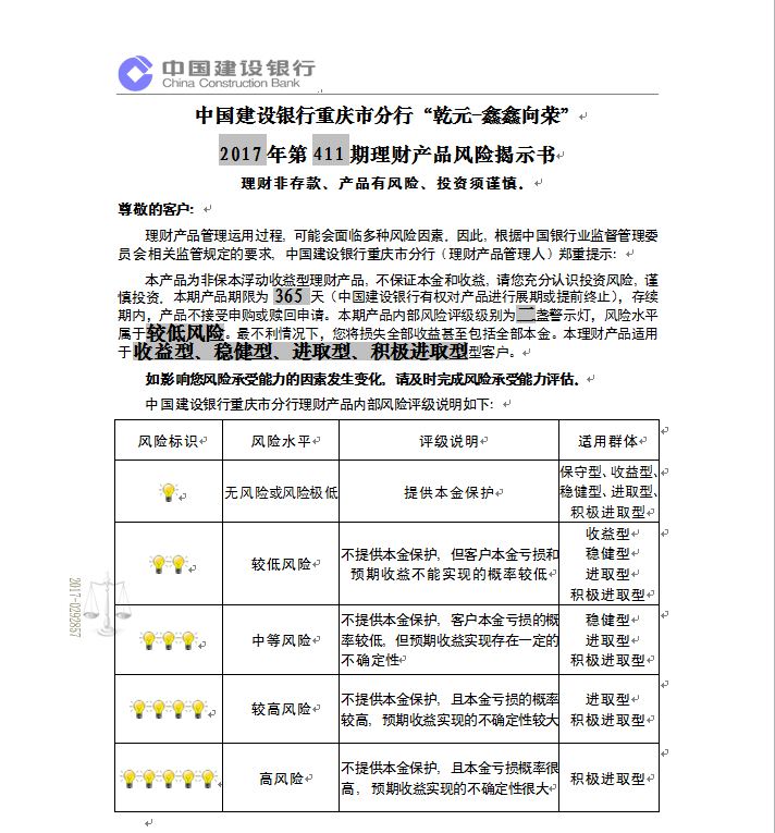 中国建设银行重庆市分行“乾元-鑫鑫向荣” 2017年第411期理财产品说明书和风险揭示书
