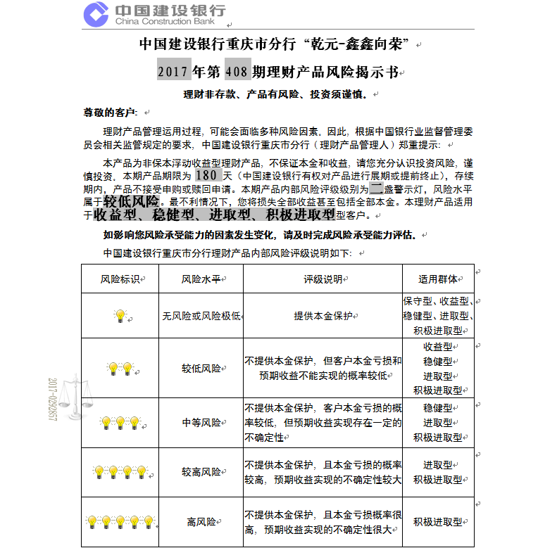 中国建设银行重庆市分行“乾元-鑫鑫向荣” 2017年第408期理财产品说明书和风险揭示书