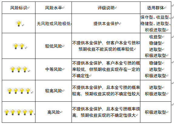 本产品为非保本浮动收益型理财产品,不保证本金和收益,请您充分认识投资风险,谨慎投资。本期产品期限为146天(中国建设银行有权对产品进行展期或提前终止),存续期内,产品不接受申购或赎回申请。本期产品内部风险评级级别为盏警示灯,风险水平属于较低风险。最不利情况下,您将损失全部收益甚至包括全部本金。本理财产品适用于收益型、稳健型进取型 积极进取型客户。