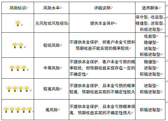 本产品为非保本浮动收益型理财产品,不保证本金和收益,请您充分认识投资风险,谨慎投资。本期产品期限为223天(中国建设银行有权对产品进行展期或提前终止),存续期内,产品不接受申购或赎回申请。本期产品内部风险评级级别为盏警示灯,风险水平属于中等风险。最不利情况下,您将损失全部收益甚至包括全部本金。本理财产品适用于稳健型进取型 积极进取型客户。