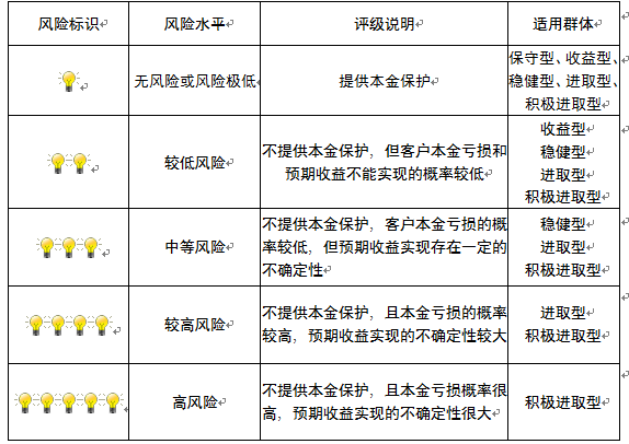 ,风险水平属于较低风险。最不利情况下,您将损失全部收益甚至包括全部本金。本理财产品适用于收益型、稳健型、进取型 、积极进取型客户。