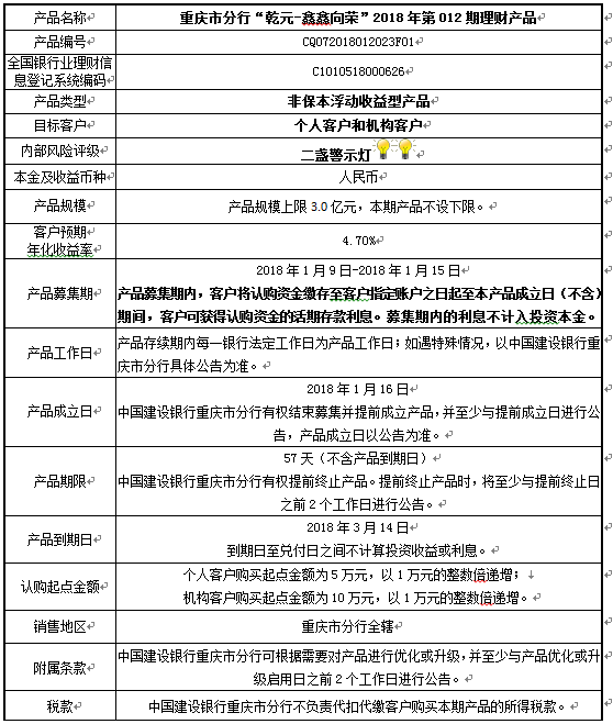 1.本期产品规模上限:3.0亿元。在本期产品募集期内,对本期产品的认购金额达到本期理财产品规模上限,则中国建设银行重庆市分行有权利但无义务停止本期产品的认购,已经认购成功的客户投资权益不受影响。