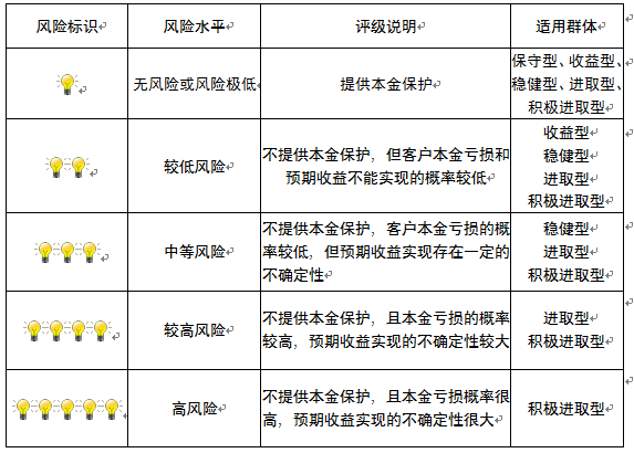 本产品为非保本浮动收益型理财产品,不保证本金和收益,请您充分认识投资风险,谨慎投资。本期产品期限为68天(中国建设银行有权对产品进行展期或提前终止),存续期内,产品不接受申购或赎回申请。本期产品内部风险评级级别为盏警示灯 ,风险水平属于较低风险。最不利情况下,您将损失全部收益甚至包括全部本金。本理财产品适用于收益型、稳健型、进取型 积极进取型客户。