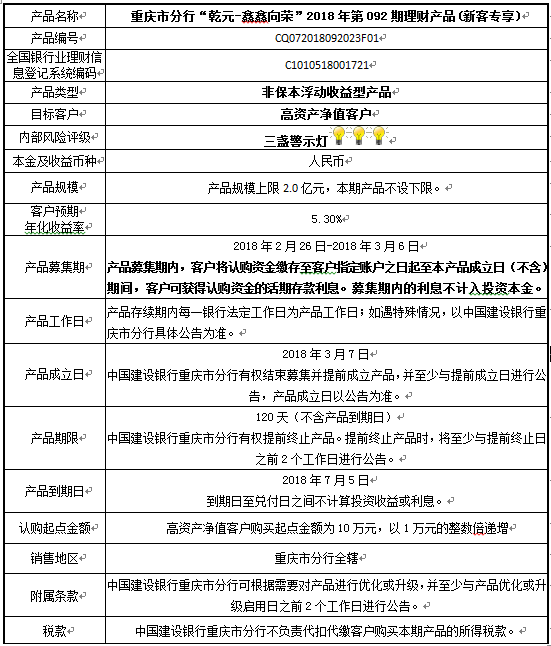 3.中国建设银行重庆市分行可根据市场情况等调整产品规模上、下限,并最迟于调整规模上下限当日进行公告。