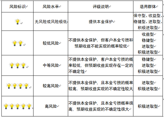 本产品为非保本浮动收益型理财产品,不保证本金和收益,请您充分认识投资风险,谨慎投资。本期产品期限为133天(中国建设银行有权对产品进行展期或提前终止),存续期内,产品不接受申购或赎回申请。本期产品内部风险评级级别为二盏警示灯 ,风险水平属于较低风险。最不利情况下,您将损失全部收益甚至包括全部本金。本理财产品适用于收益型、稳健型、进取型 、积极进取型客户。