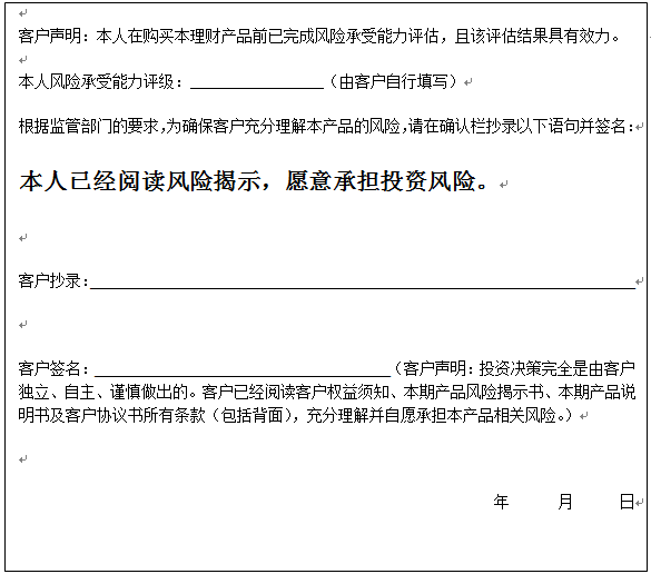 个人客户请在下面填写您的风险承受能力评级、抄录风险揭示语句并签字: