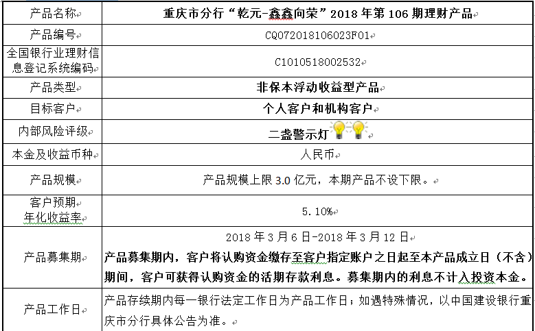 中国建设银行重庆市分行“乾元-鑫鑫向荣” 2018年第106期理财产品风险揭示书和说明书
