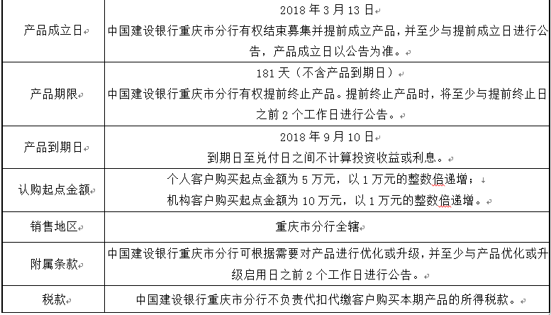 3.中国建设银行重庆市分行可根据市场情况等调整产品规模上、下限,并最迟于调整规模上下限当日进行公告。