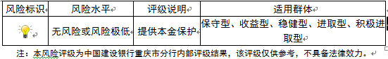 本期产品为保本浮动收益型理财产品,本理财产品有投资风险,只保障理财资金本金,不保证理财收益,您应当充分认识投资风险,谨慎投资。本期产品期限为180天(中国建设银行重庆市分行有权对产品进行展期或提前终止)。本期产品内部风险评级级别为一盏警示灯,风险程度属于无风险或风险极低,适用于保守型、收益型、稳健型、进取型及积极进取型投资者。最不利情况下,客户只能收回投资本金,不能获得任何投资收益。
