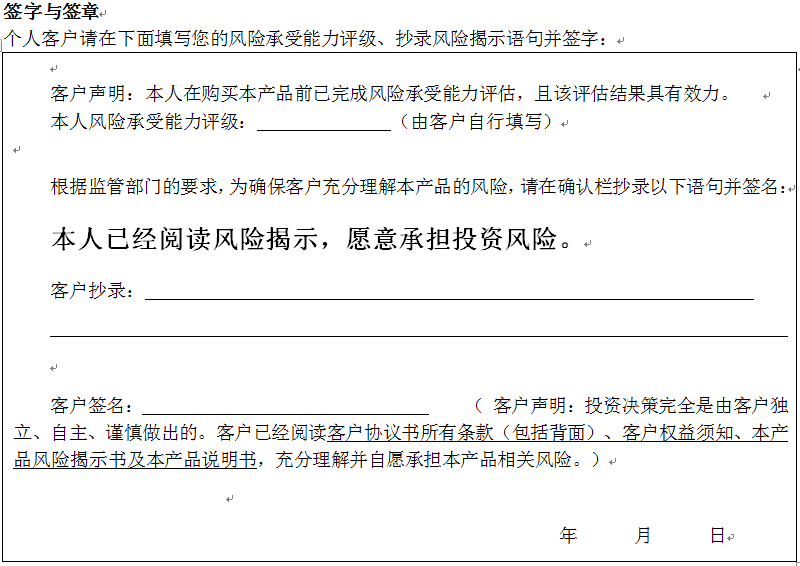 您签署本风险揭示书、客户协议书,并将资金委托给中国建设银行重庆市分行运作是您真实的意思表示。本风险揭示书及相应的客户协议书、产品说明书、客户权益须知将共同构成贵我双方理财合同的有效组成部分。