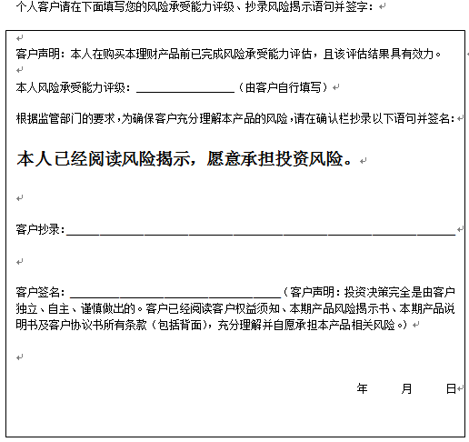 在您签署《中国建设银行股份有限公司理财产品客户协议书》前,应当仔细阅读客户权益须知、本风险揭示书及本产品的产品说明书的全部内容,同时向中国建设银行重庆市分行了解本产品的其他相关信息,并自己独立做出是否认(申)购本产品的决定。