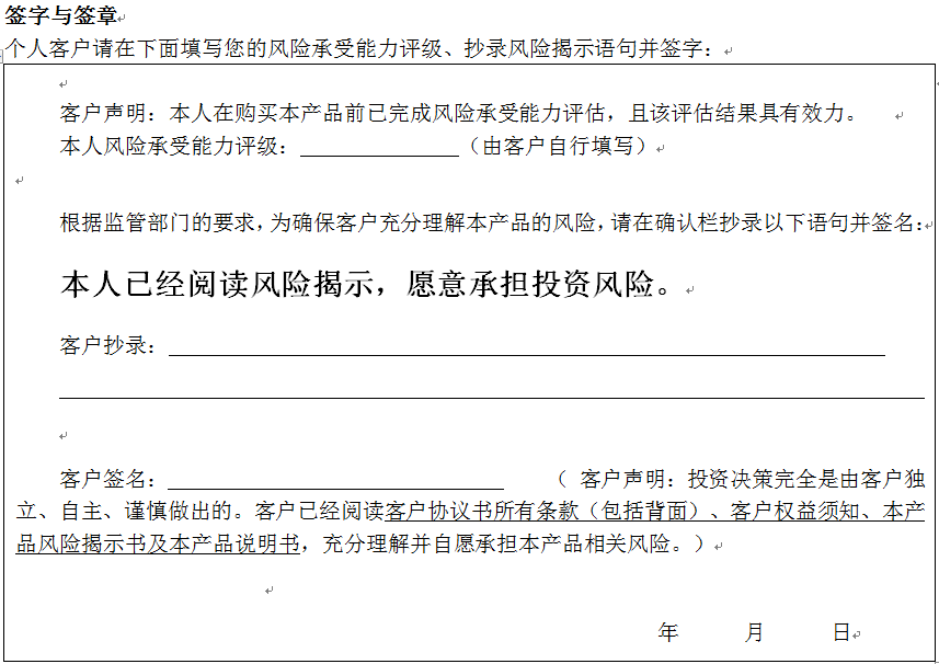 您签署本风险揭示书、客户协议书,并将资金委托给中国建设银行重庆市分行运作是您真实的意思表示。本风险揭示书及相应的客户协议书、产品说明书、客户权益须知将共同构成贵我双方理财合同的有效组成部分。