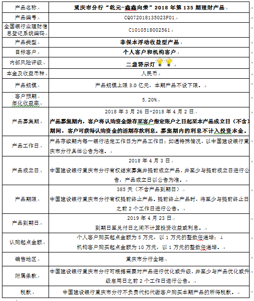 中国建设银行重庆市分行“乾元-鑫鑫向荣” 2018年第135期理财产品风险揭示书和说明书