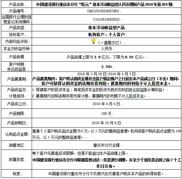 本期产品为保本浮动收益型理财产品,本理财产品有投资风险,只保障理财资金本金,不保证理财收益,您应当充分认识投资风险,谨慎投资。本期产品期限为188天(中国建设银行重庆市分行有权对产品进行展期或提前终止)。本期产品内部风险评级级别为一盏警示灯